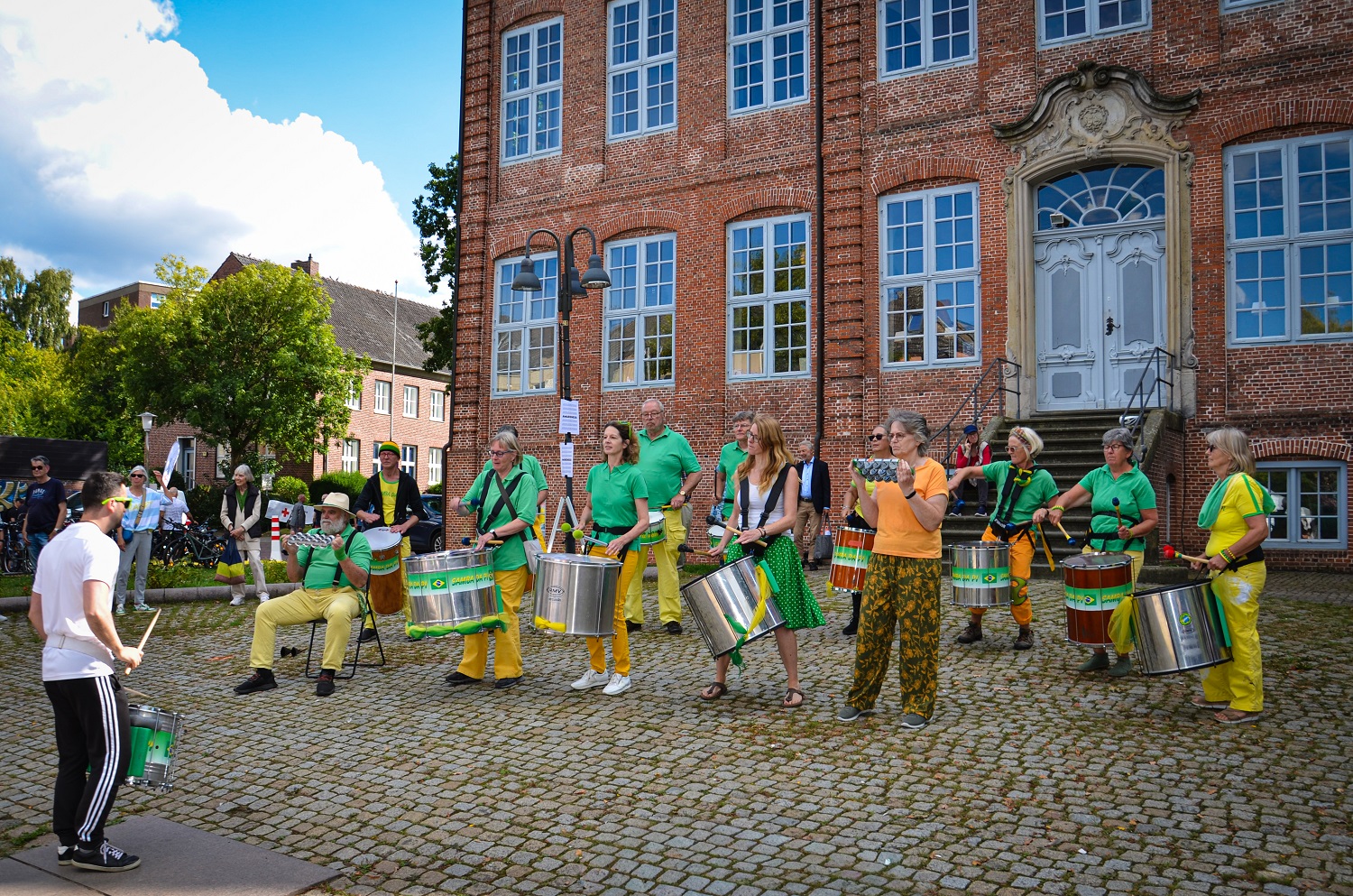 Der Tag beginnt um 11:00 Uhr vor der Drostei mit einem schwungvollen Auftritt unserer Sambagruppe, gefolgt von besonderen Klängen auf dem Dudelsack.