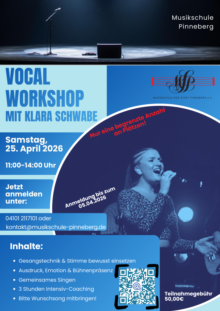 Dann ist unser Vokal-Workshop mit Klara Schwabe genau das Richtige für dich! In drei Stunden Intensiv-Coaching arbeiten wir gemeinsam an Gesangstechnik und gesunder Stimmbildung, entdecken neue Ausdrucksmöglichkeiten und stärken deine Bühnenpräsenz. Neben praktischem Training zu Atmung, Klang und Interpretation steht vor allem eines im Mittelpunkt: die Freude am gemeinsamen Singen.